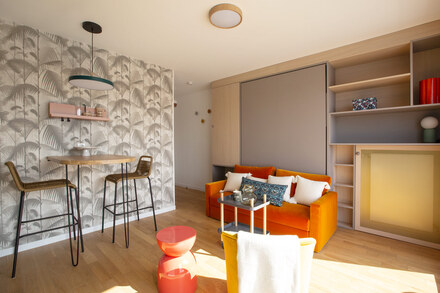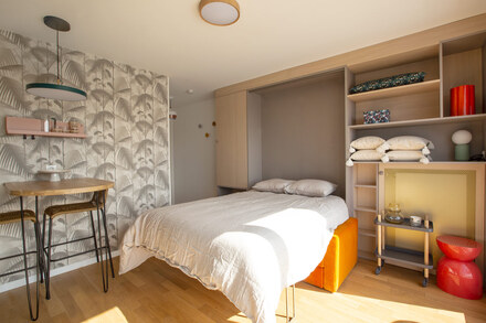 This apartment consists of a living room with a sofa and a foldaway bed, an american kitchen, a bathroom and a terrace of 6m2 facing south with a clear view of the Pantheon and the Eiffel Tower. The overall energy rating (DPE) of the apartment is D, details below