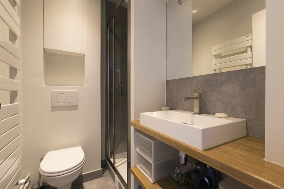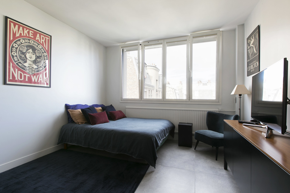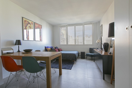 24 sq. m. furnished studio on Rue Duhesme in the Montmartre district of the 18th arrondissement - Paris. One bedroom, living room, open-plan kitchen, bathroom with shower stall. Internet access. Heating by district heaters.