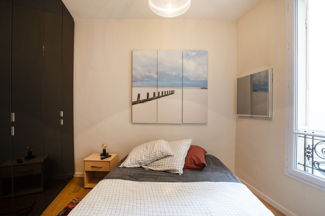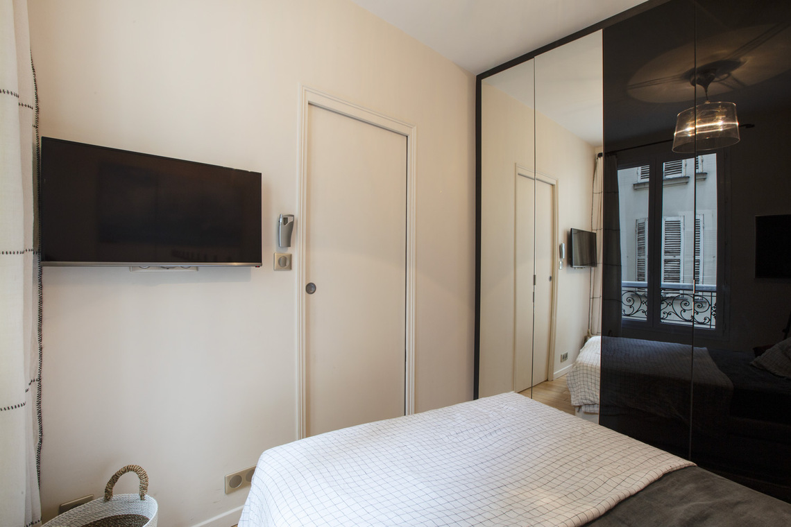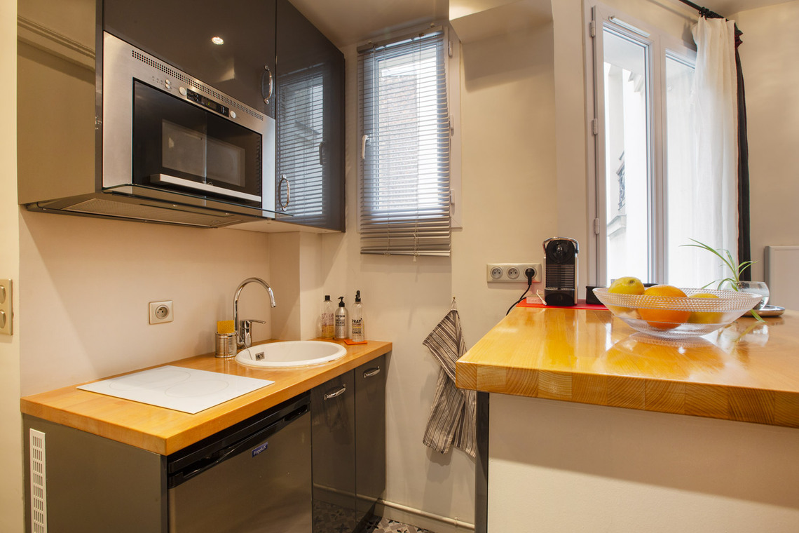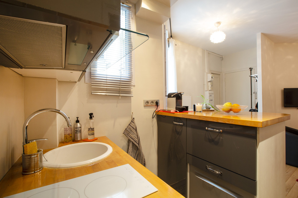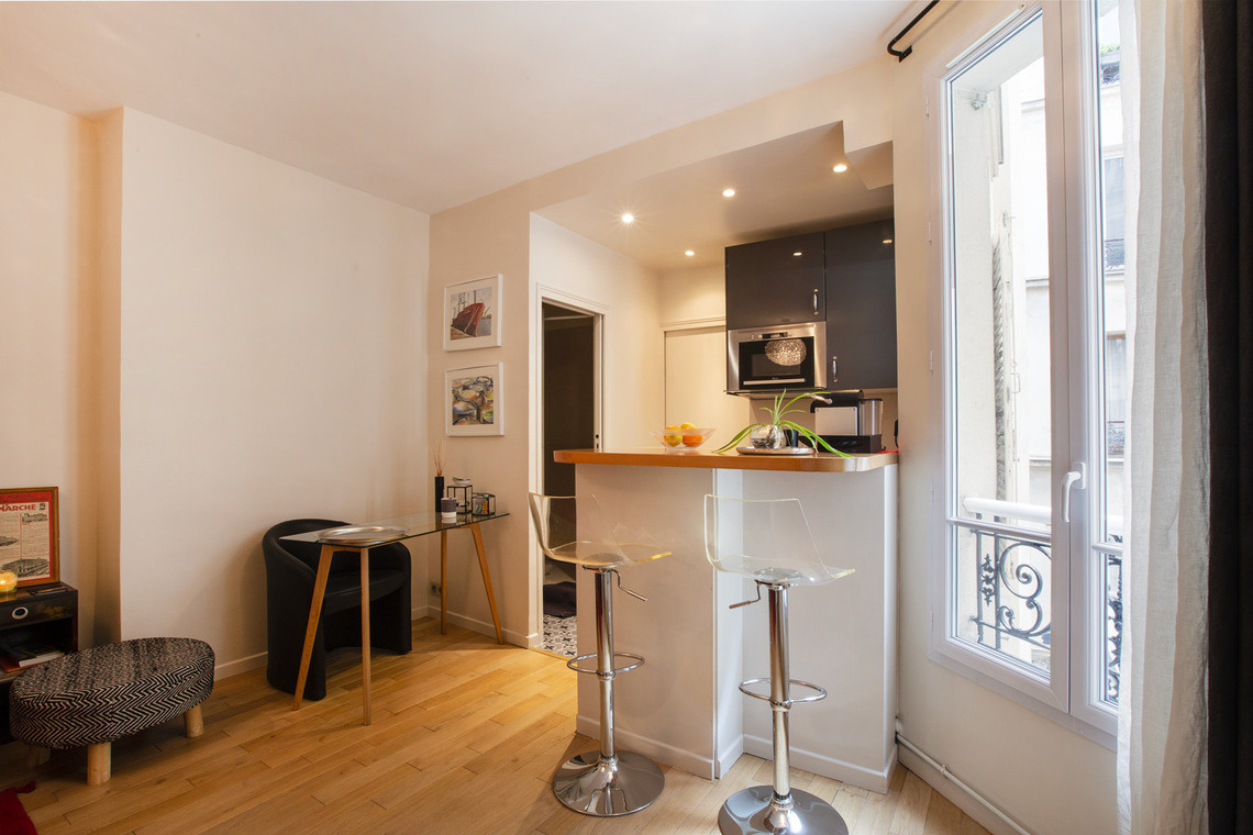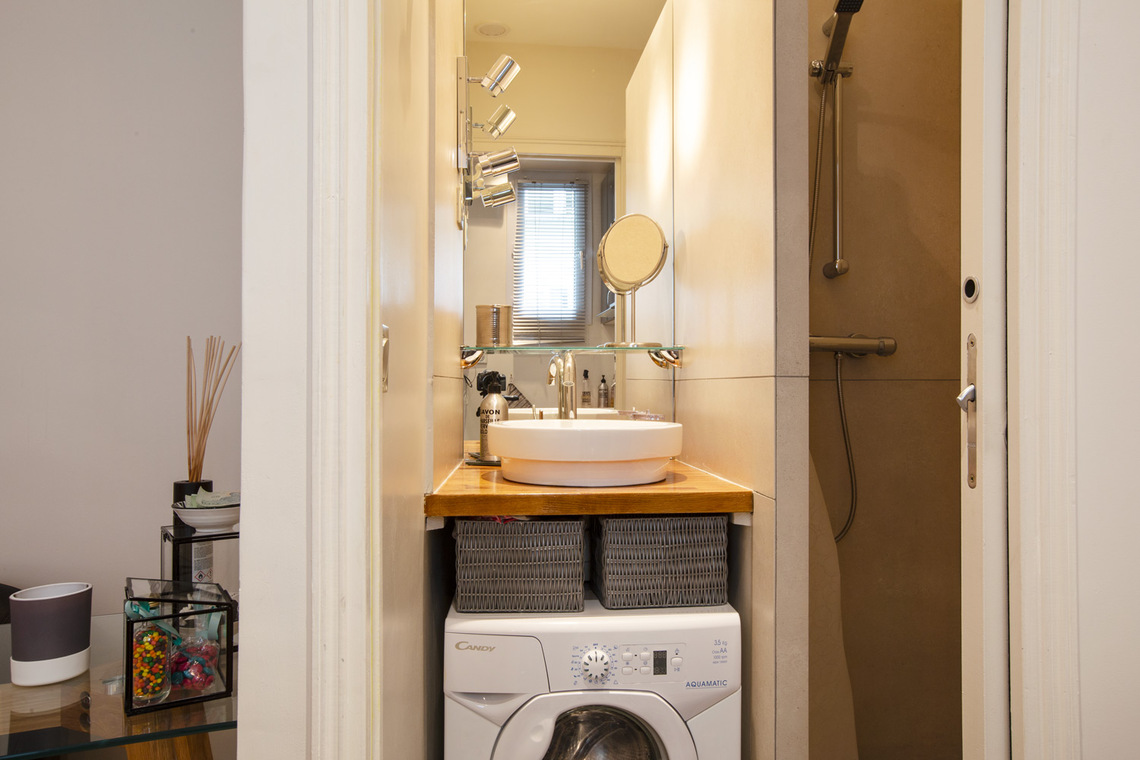 27 sq. m. furnished apartment on Rue du Regard in the Luxembourg district of the 6th arrondissement - Paris. One bedroom, living room, open-plan kitchen, bathroom with shower stall and separate toilet. Heating by electric (individual).