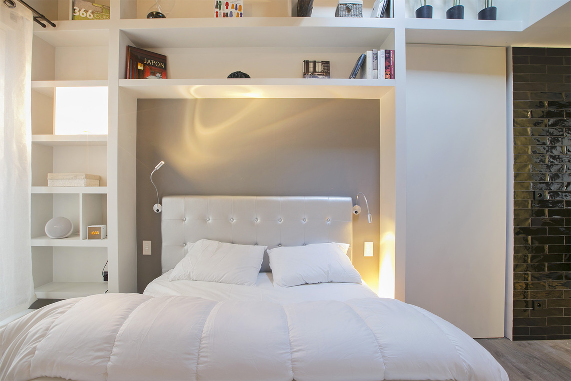 La chambre dispose d’un lit haut de gamme Queen Size et de spacieux rangement.
