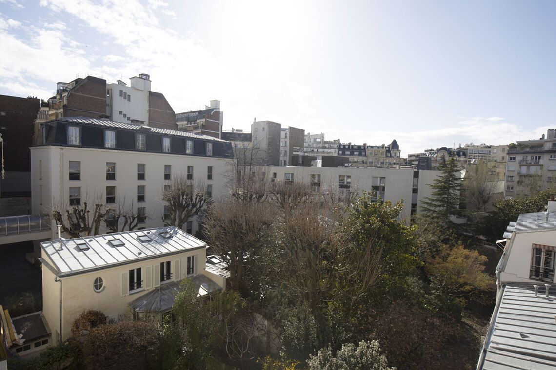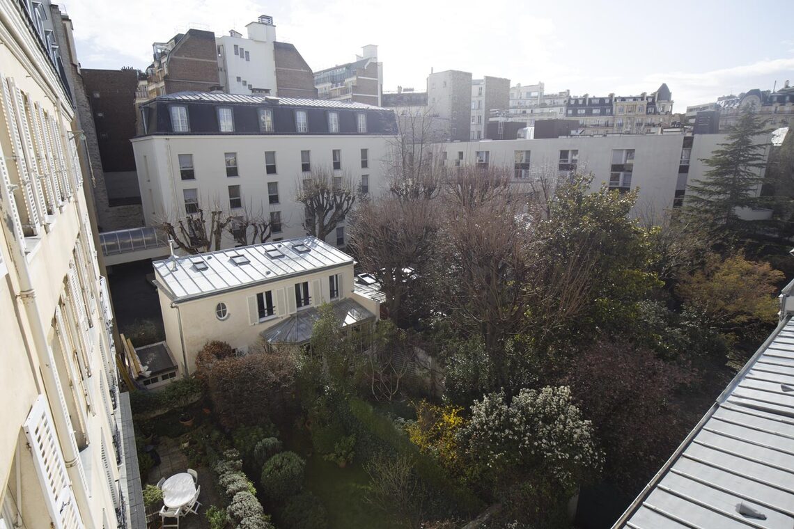 Ce bien se trouve dans un immeuble parisien de standing au 3ème étage sans ascenseur. Il dispose d'une vue dégagée sur jardins et offre un calme absolu.