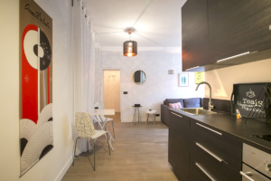 This small apartment feels bigger than it is, with an American kitchen with dining table, bedroom separated by a sliding door, functional bathroom and best of all, a view of Saint Sulpice church.